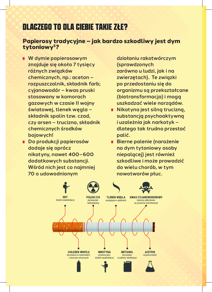 Na całym świecie tytoń zabija ponad 5 milionów osób każdego roku – w tym ponad 600 tysięcy osób, które palą biernie. Bierne palenie jest szczególnie niebezpieczne dla niemowląt i małych dzieci, których układ oddechowy wciąż się rozwija a mechanizmy odpornościowe dopiero „uczą się” jak prawidłowo bronić organizm. Nie istnieje żaden bezpieczny czas, w którym dziecko może być wystawione na oddziaływanie biernego palenia, dlatego należy zawsze zrezygnować z nałogu, w przypadku posiadania lub planowania dziecka. Papieros zawiera ok. 7000 szkodliwych dla zdrowia związków, a 70 z nich jest przyczyną zachorowań na nowotwory. Oprócz nowotworów istnieje szereg groźnych konsekwencji palenia: miażdżyca, zawał, udar mózgu, , astma.