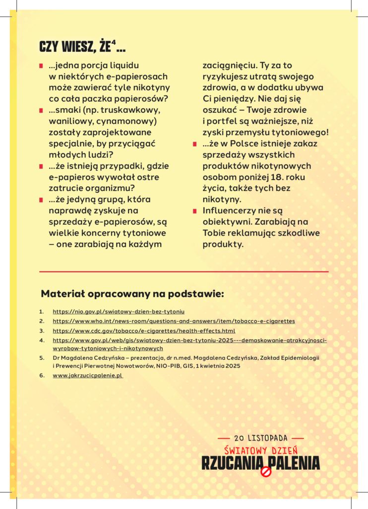 W 2025 roku Światowy Dzień Rzucania Palenia Tytoniu przypada na 20 listopada 2025 ( czwartek).
