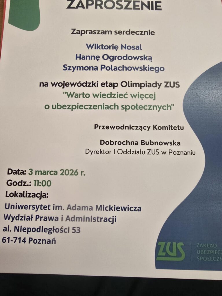 W dniu 2.03.2026r. uczniowie naszej szkoły Wiktoria Nosal, Hanna Ogrodowska i Szymon Polachowski wzięli udział w II etapie Olimpiady „Warto wiedzieć więcej o ubezpieczeniach społecznych”